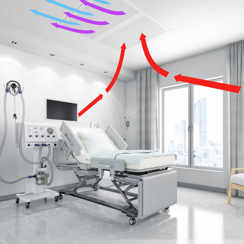 The CARES is designed specifically for hospital patient rooms. This product provides an all-in-one airflow solution for isolation-ready patient rooms, allowing the hospital to change from standard operation of the patient room to isolation mode as required.